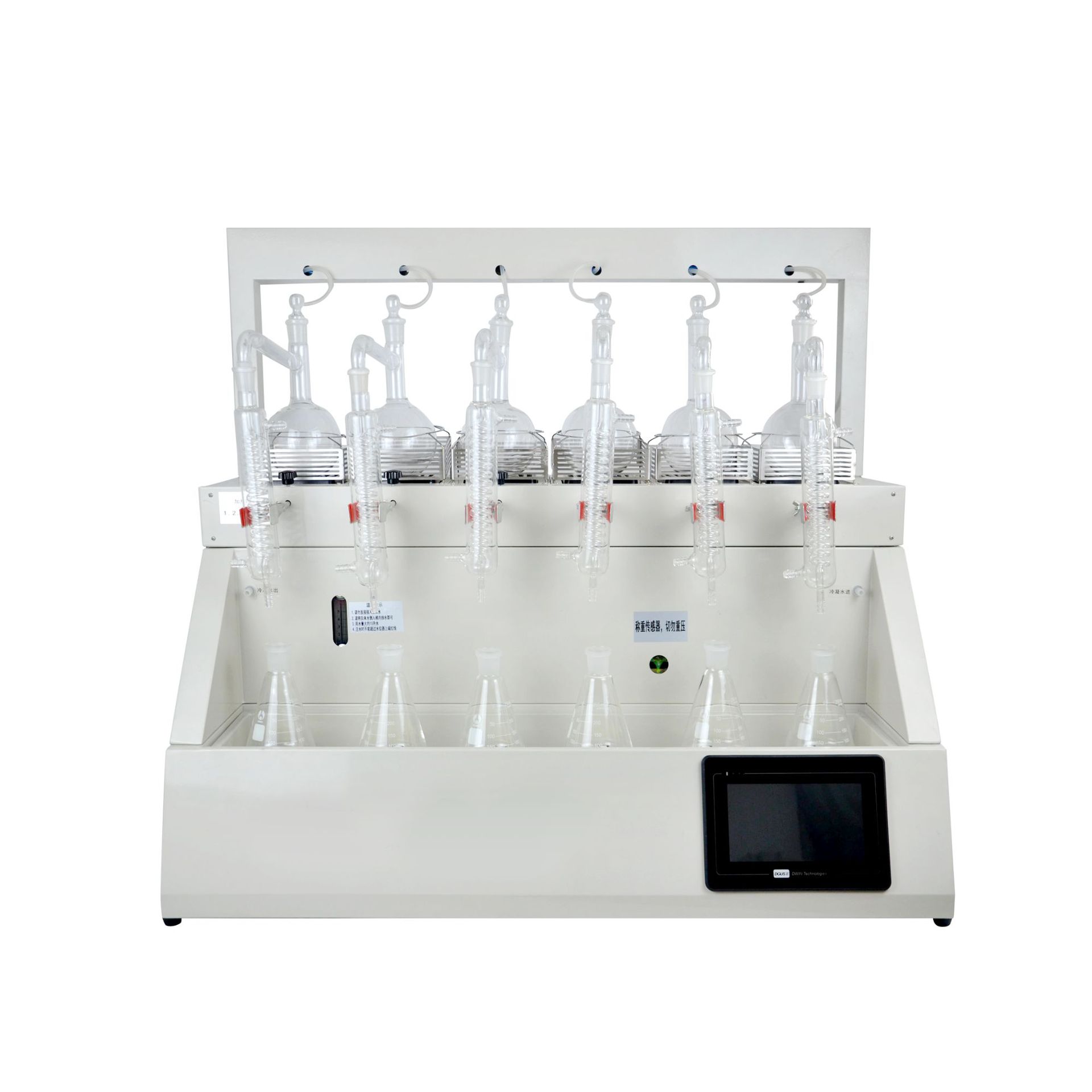 本产品是根据实验室蒸馏预处理操作规程,集恒温加热、蒸馏终点自动控制、冷却水循环于一体的新型智能蒸馏处理装置。该仪器实验了精密控温、自动防倒吸、加热均匀、防暴沸、智能终点控制等功能。使用方便,节能环保。广泛适用于环保、疾控、水产、供排水、高校、科研院所、厂矿企业等各类化学实验室需要蒸馏处理的场所,如挥发酚、氰化物、氨氮、凯氏氮油中水分等项目的蒸馏处理。